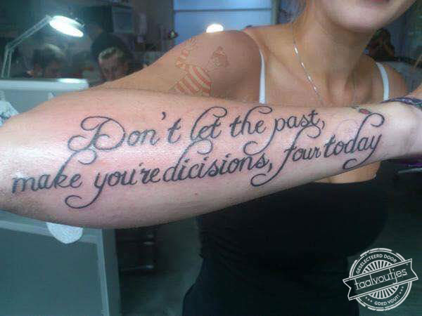 Een lijfspreuk hebben betekent voor de meeste mensen niet dat ze die daadwerkelijk op hun lijf laten vereeuwigen. Maar als je dat wel doet, is het wellicht verstandig de tekst een aantal keer te controleren én een tatoeëerder zonder dyslexie uit te kiezen. Dit zijn 20 voorbeelden van mensen die die cruciale stappen vergaten.