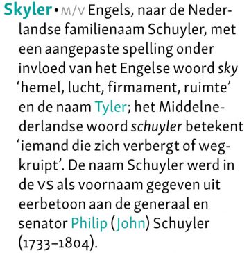 Zo zijn er meer namen die door een foutje of verkeerde interpretatie zijn ontstaan. Zoals bij Imogen uit het toneelstuk Cymbeline van William Shakespeare: Shakespeare schreef de naam als ‘Innogen’, dus met dubbel-n, maar daar maakte de drukker per ongeluk een ‘m’ van, iets wat daarna nooit meer goed gekomen is. Of wat te denken van de populaire naam Skyler? Dat is de verengelste vorm van de Nederlandse achternaam Schuyler (‘iemand die zich verbergt of wegkruipt’), die veranderde onder invloed van sky – ‘hemel, lucht, firmament, ruimte’ -en de naam Tyler.