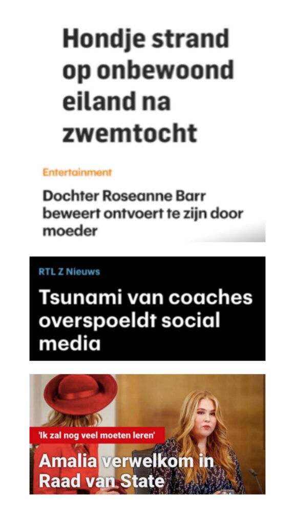 De klassieke dt-voutjes komen het meest voor. Zo ‘strand’ er een hondje op een onbewoond eiland en is de dochter van Roseanne Barr ‘ontvoert’ door haar moeder. Iets minder klassiek: een tsunami van coaches ‘overspoeldt’ de social media. Ten slotte laat de stagiair -misschien wel in blinde spellingspaniek- de laatste letter van werkwoordvervoeging geregeld gewoon achterwege: Amalia wordt dus ‘verwelkom’ in de Raad van State en ‘hang’ er Willem Engel van alles boven het hoofd.