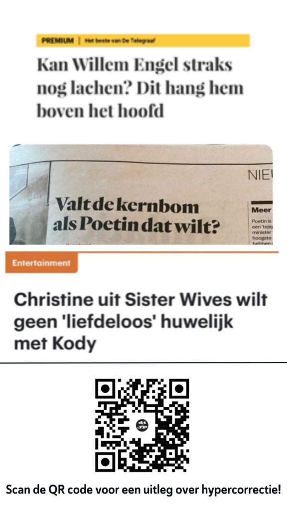 Je zult misschien denken dat wij in de redactie van ‘10 voor Taal’ gruwen van deze fouten. Niets is minder waar: we smúllen van headlines met een klein gebrek. Dus alsjeblieft, lieve stagiairs van Nederland, blijf luisteren naar de hypercorrectiestem in jullie hoofden, blijf fouten maken en blijf ze vooral ook publiceren! Jullie maken er een clubje medewerkers van een taalprogramma zo ontzettend gelukkig mee.