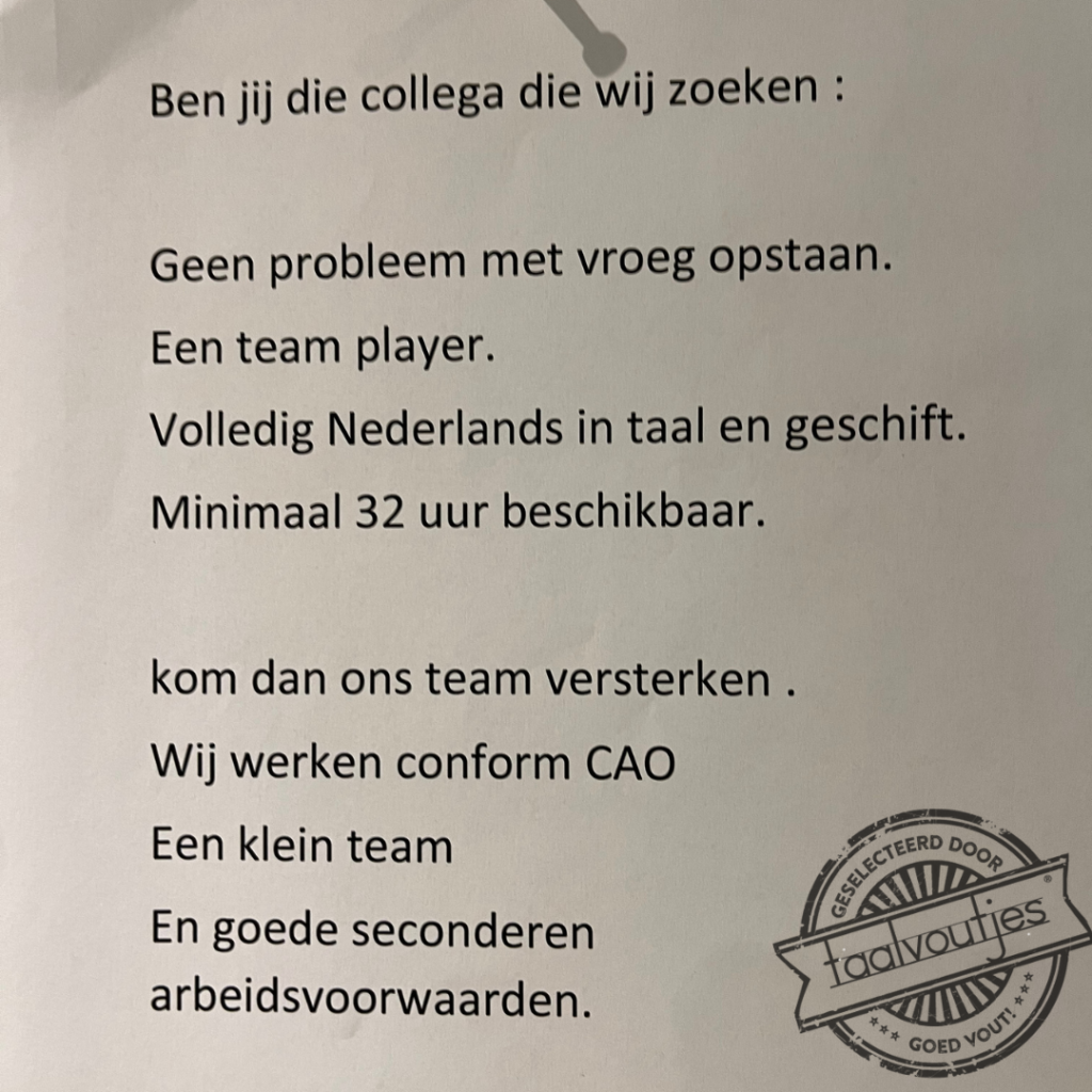 Hoewel krantenkoppen het laatste jaar veelal in het teken stonden van een energiecrisis, een politiek fiasco en een oorlog tussen Palestina en Israël, was daar in de taalvoutjes weinig van te merken. De afgelopen week konden jullie je favorieten kiezen uit de 24 grappigste, populairste en soms ook pijnlijkste taalvouten uit het afgelopen jaar. De stemmen zijn geteld: dit is de grappigste taalvout van 2023!