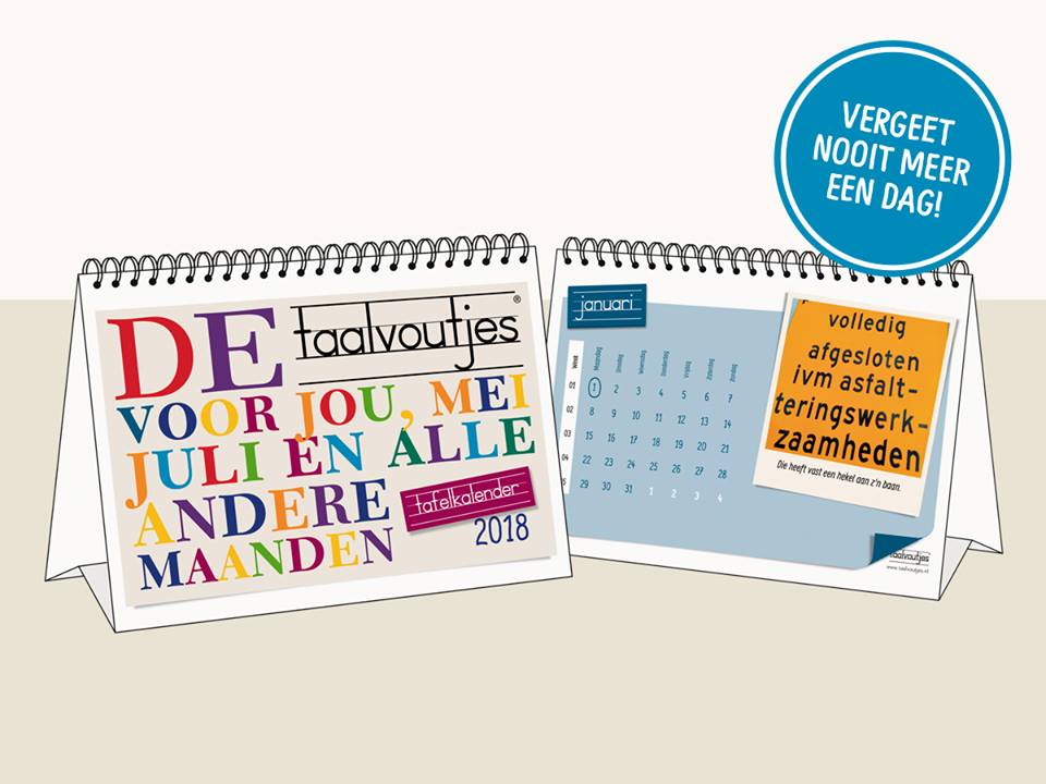 Heb jij ze ook, van die medewerkers of collega’s die altijd aan je vragen welke dag het ook alweer is? Verras ze met de Taalvoutjes-tafelkalender en ze zijn weer helemaal bij voor 2018. Zo wordt werken weer leuk!