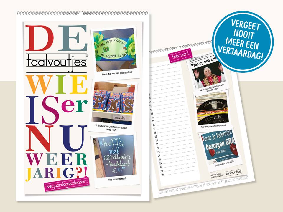 Vergeet nooit meer een verjaardag met de unieke Taalvoutjes ‘Wie is er nu weer jarig’-verjaardagskalender! Iedere maand word je verrast door hilarische taalvouten. Hét product om je gang of toilet op te leuken.