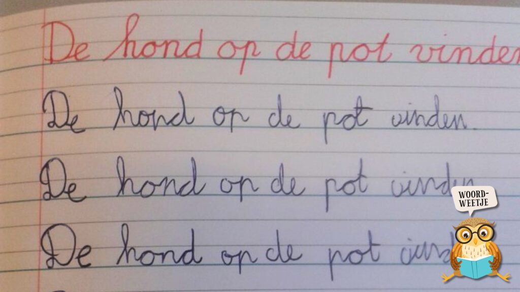 Als je dus als laatste aan tafel verscheen en de pot al op de grond stond zodat de hond de laatste beetjes eruit kon likken, dan vond je letterlijk ‘de hond in de pot’. Het dier was je voor geweest en jij kon met een rammelende maag naar bed. Het was de ultieme visuele bevestiging dat de keuken gesloten was en de buit al vergeven. De hond was in die tijd dus eigenlijk de vaatwasser van dienst, en jij viste letterlijk achter het net.